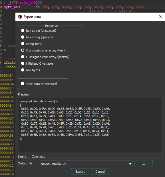 Let's extract the data using IDA. We can use that Shift+E shortcut to do so.